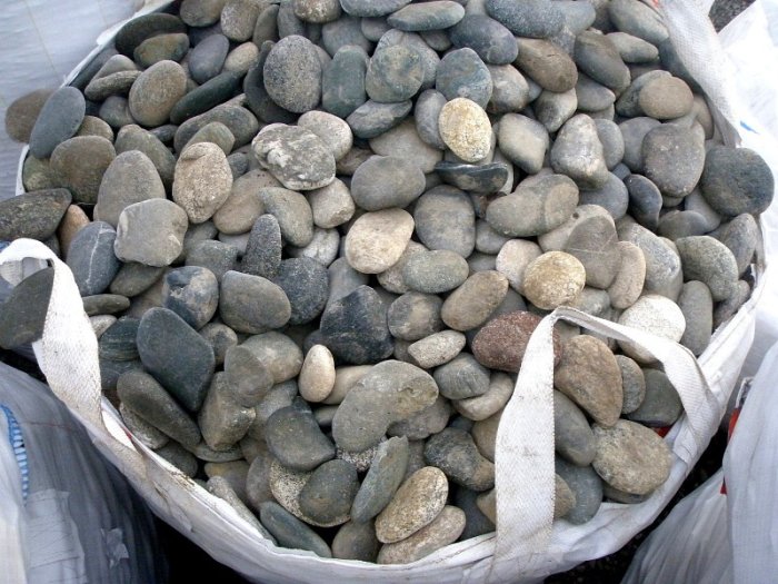 Крупная галька этого типоразмера (от 100 до 300 мм) уже напоминает небольшие валунчики: это красивый и гладкий речной камень, получивший свою округлую форму от сил природы – волн и течений. Благодаря удобной уплощенности отделка этим натуральным камнем становится очень простой: по сути, это готовая естественная облицовочная плитка или брусчатка для мощения. Такая галька, цена которой у нас низка благодаря собственной добыче, отпускается в мягких контейнерах или насыпом в кузов машины, тоннами. Эти симпатичные плоские натуральные камни у нас можно поистине удачно купить оптом!